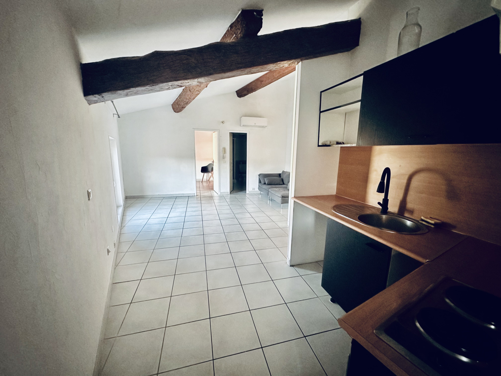 Equipé de la climatisation réversible et d'une cuisine américaine semie-équipée, le logement est loué avec une place de stationnement dans un garage clos.