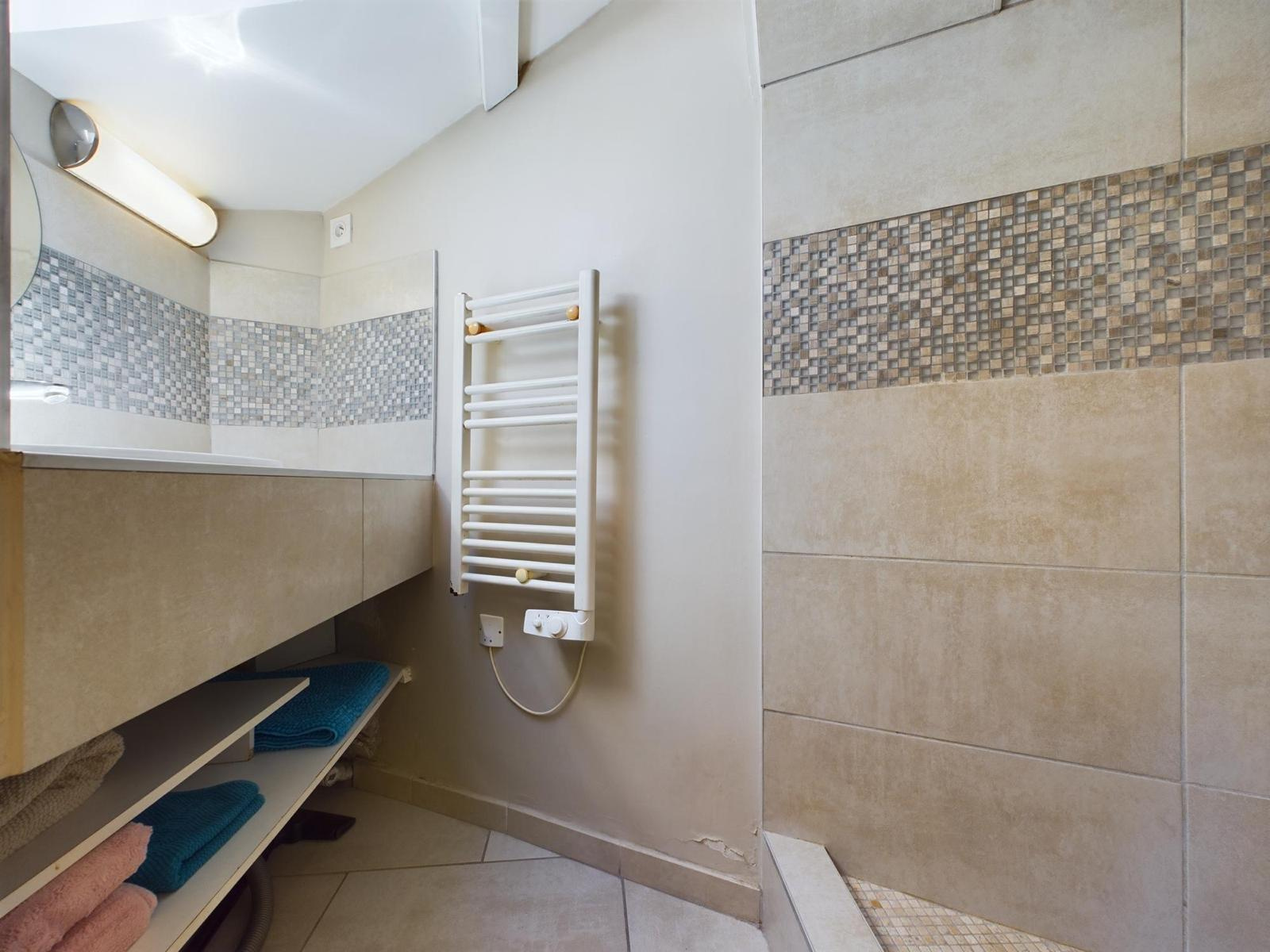 - Chambre : Une petite chambre avec deux petites fenêtres, un placard intégré et une salle d'eau attenante en bon état. La salle d'eau est équipée d'une douche à l'italienne, d'un meuble vasque et d'un velux.