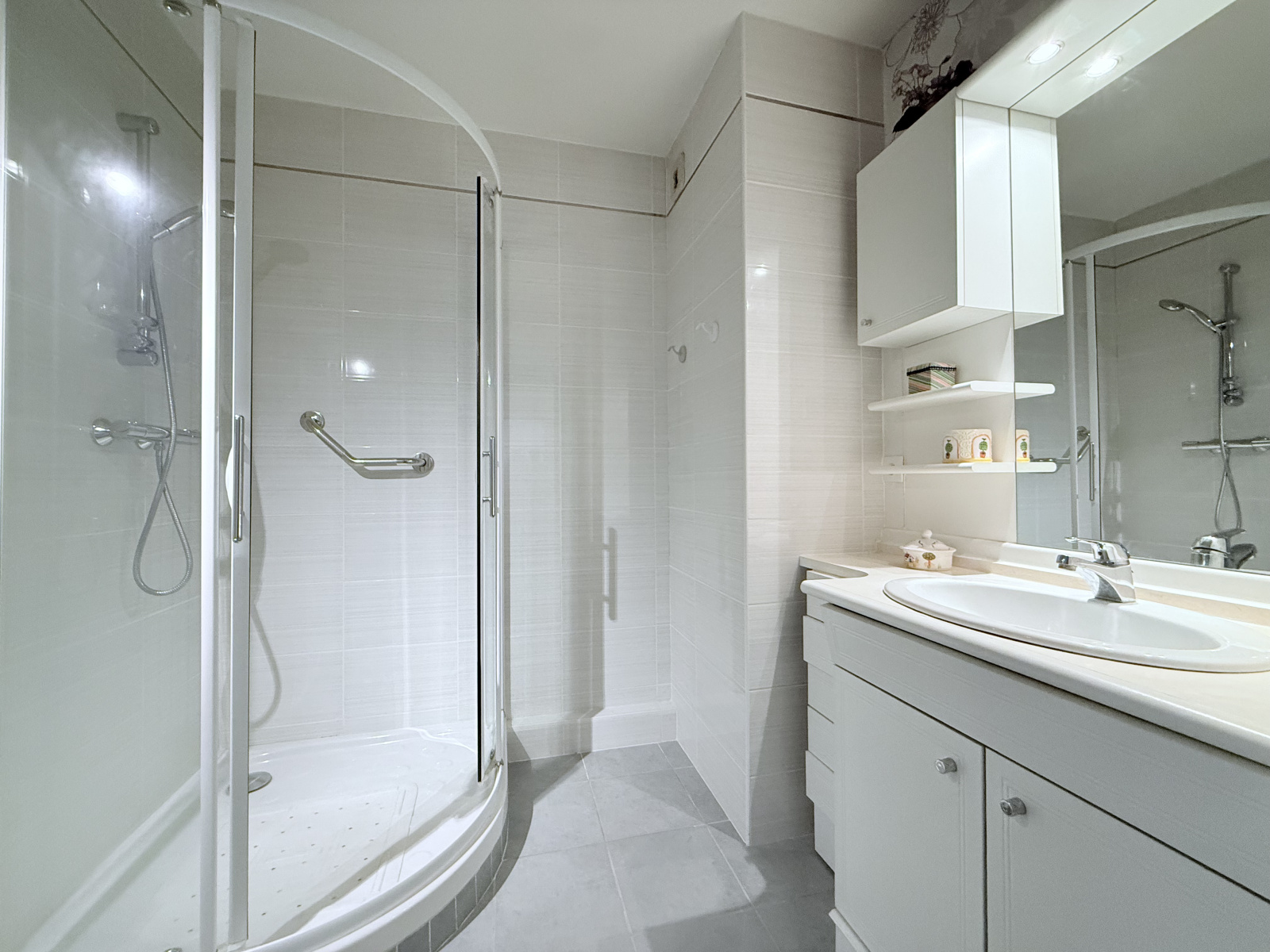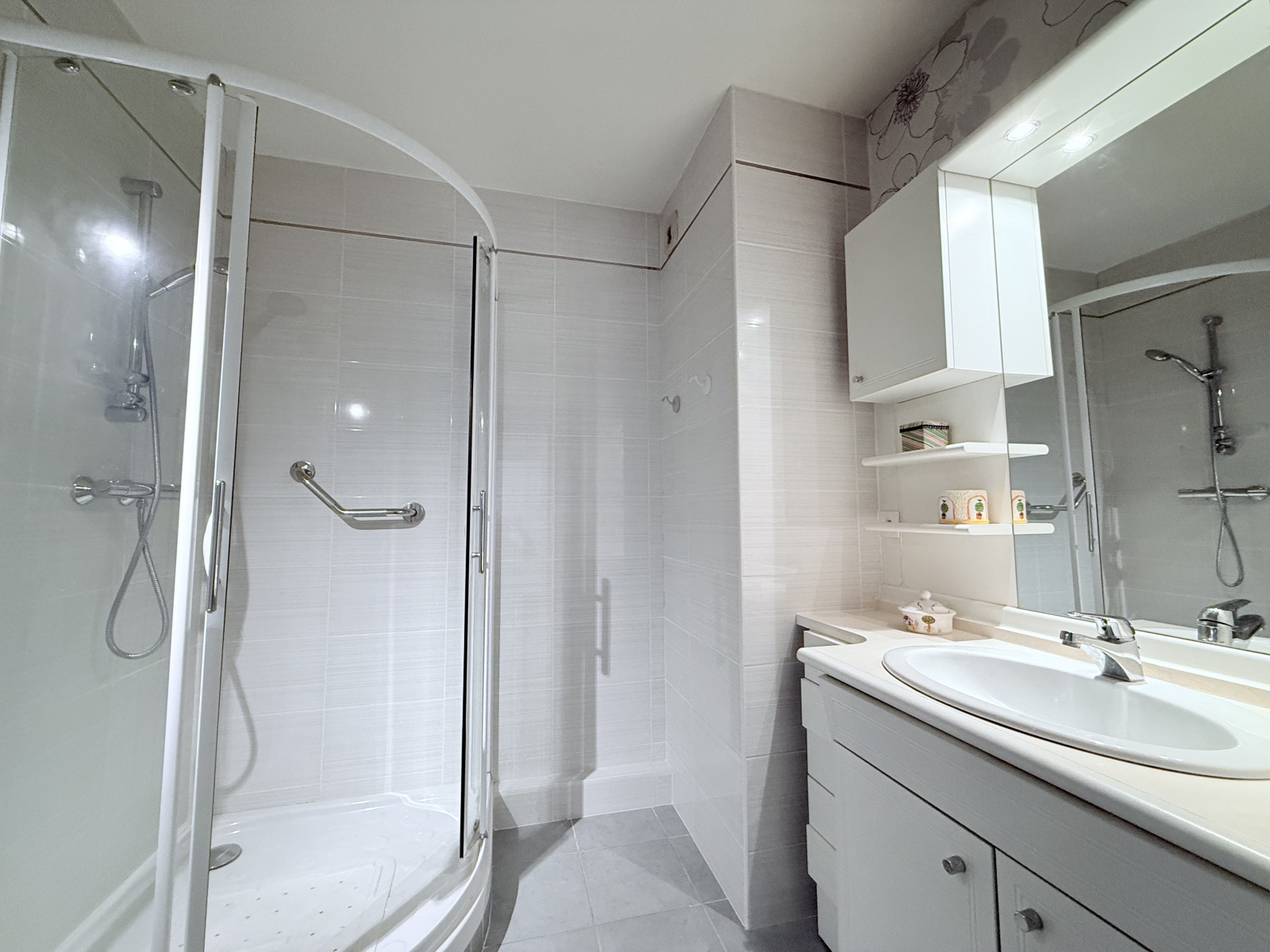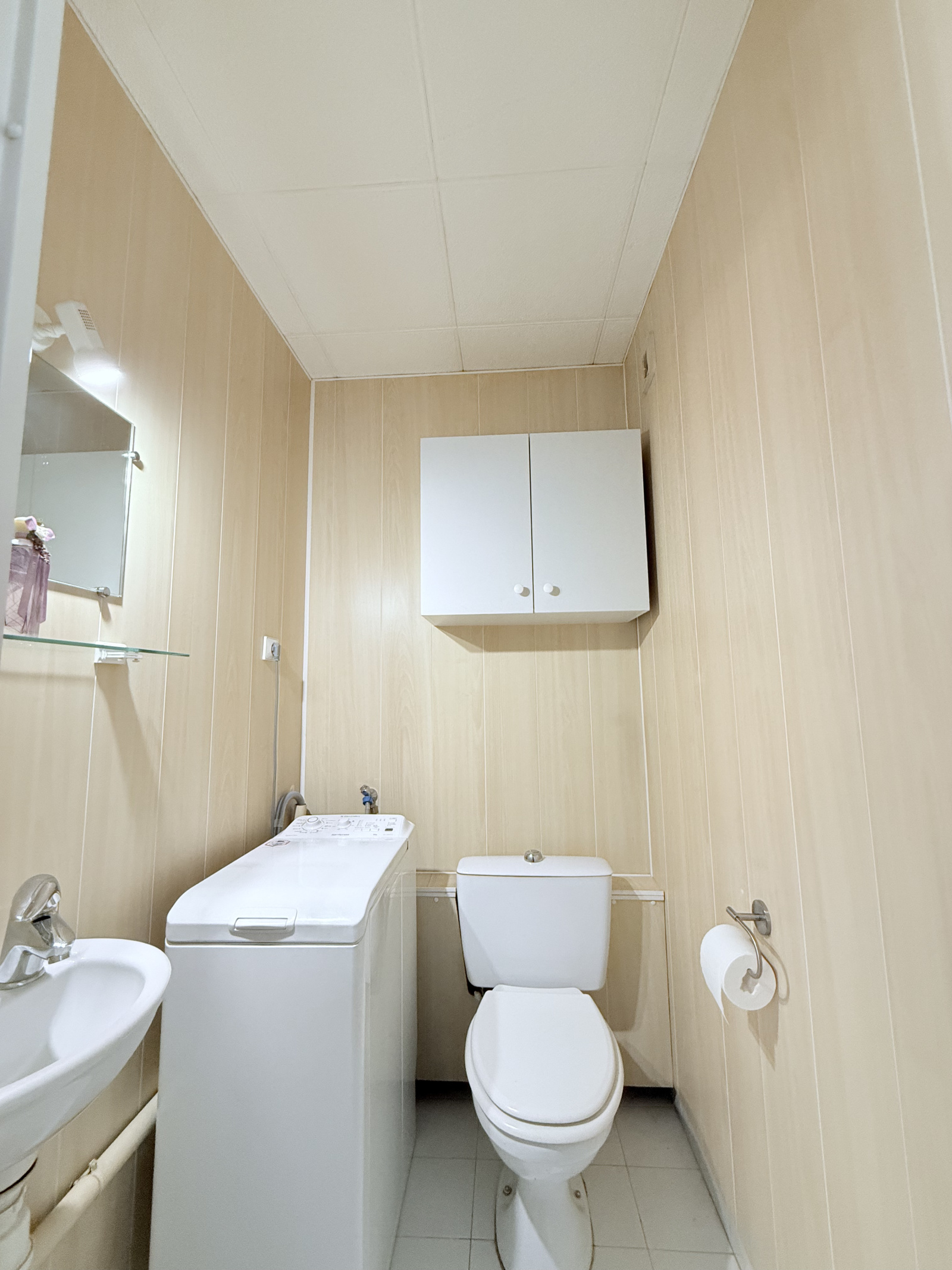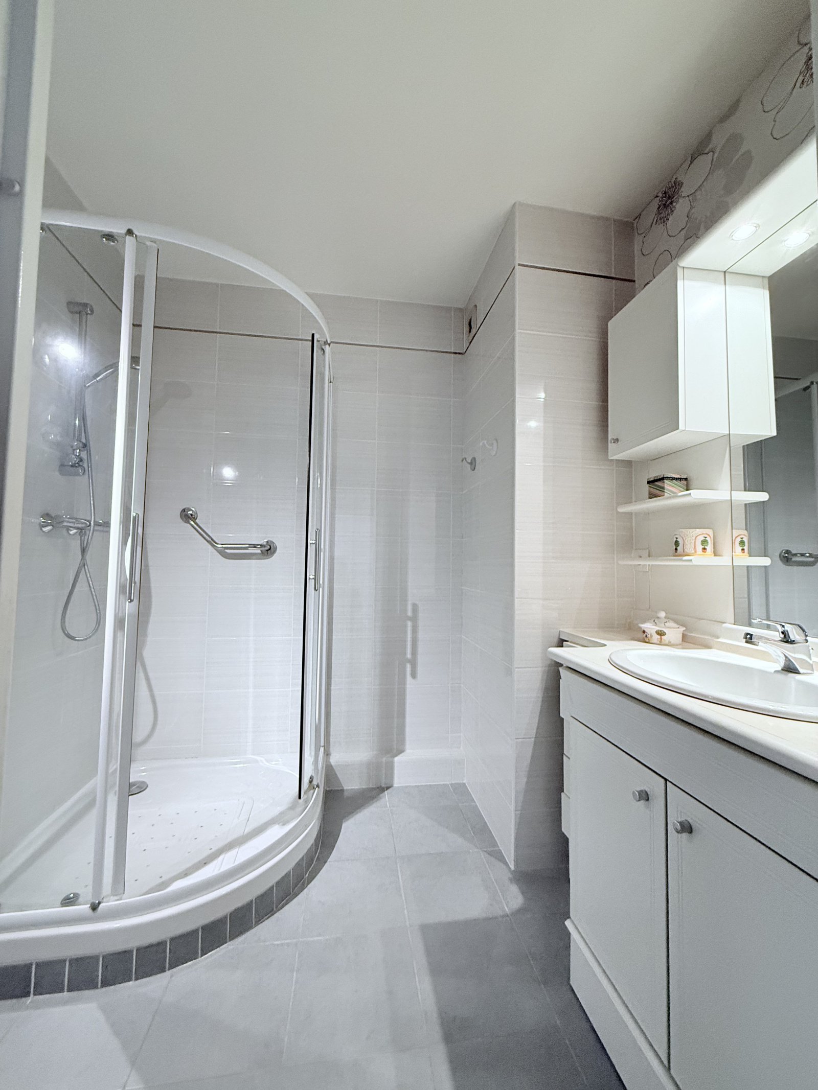 La salle d’eau est équipée d’une cabine de douche, d’un meuble vasque avec rangements et d’un sèche-serviettes. Les toilettes, indépendantes, disposent d’un lave-mains ainsi que d’un espace prévu pour une machine à laver.
