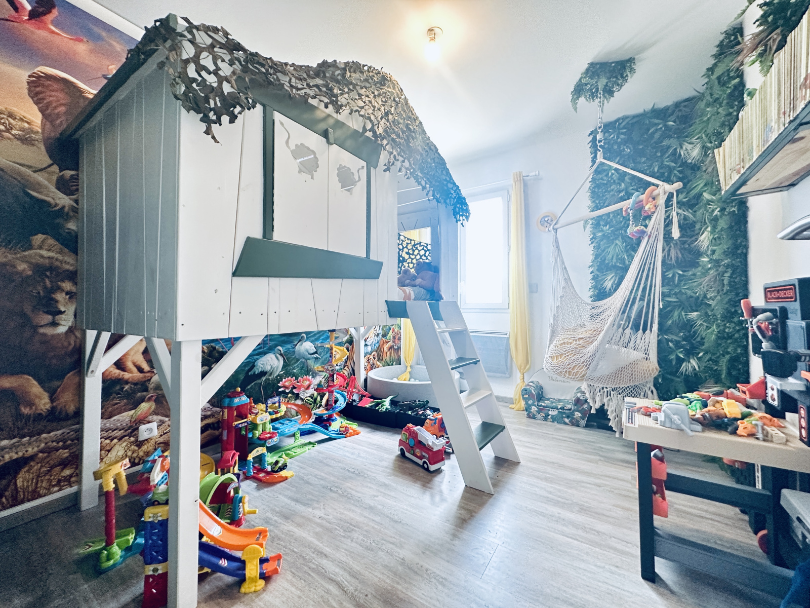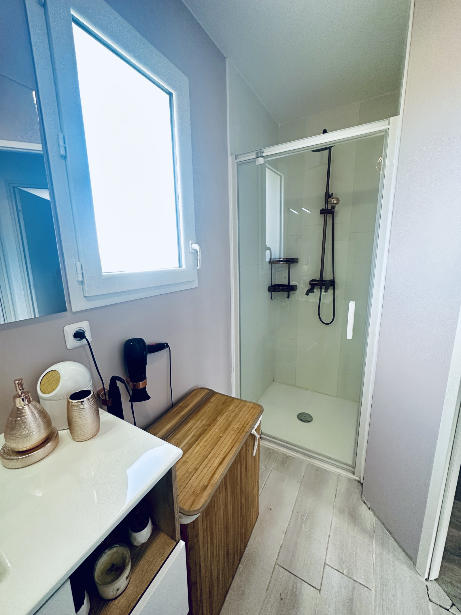 La salle de bain d'angle est équipée d'une baignoire balnéothérapie et d'une douche. Un WC se trouve à l'étage et chaque chambre dispose de son propre dressing. Le garage abrite une mezzanine, offrant un espace de rangement supplémentaire. En bas, un espace indépendant est également disponible.