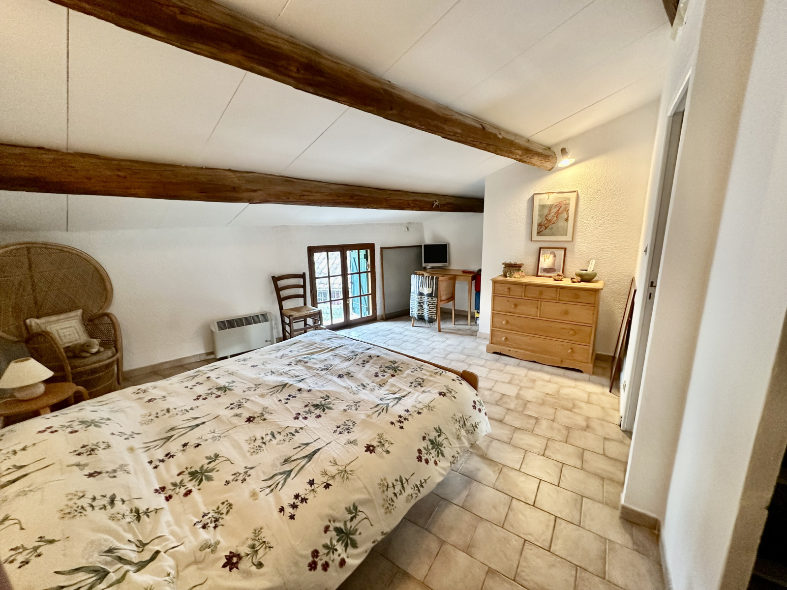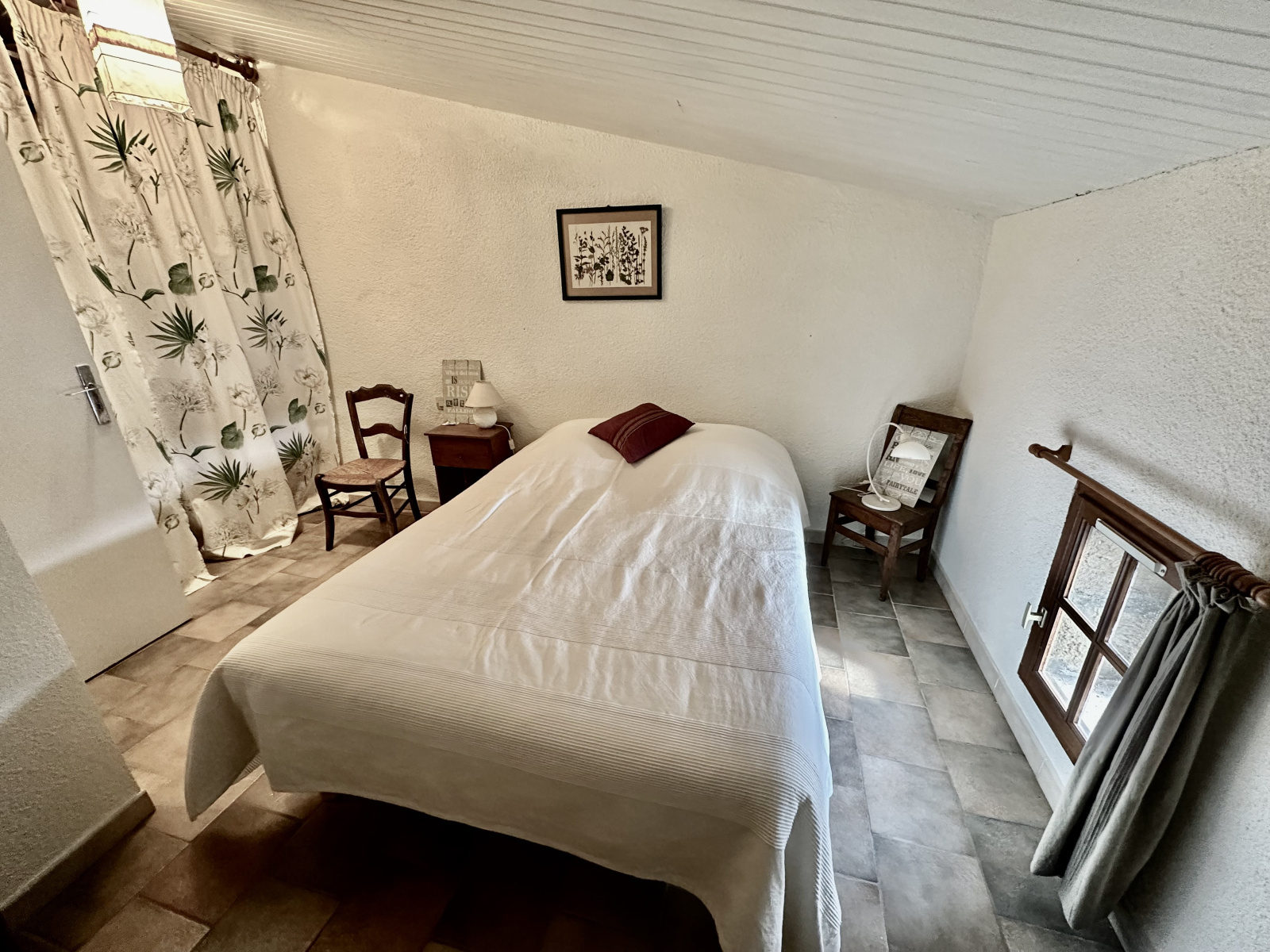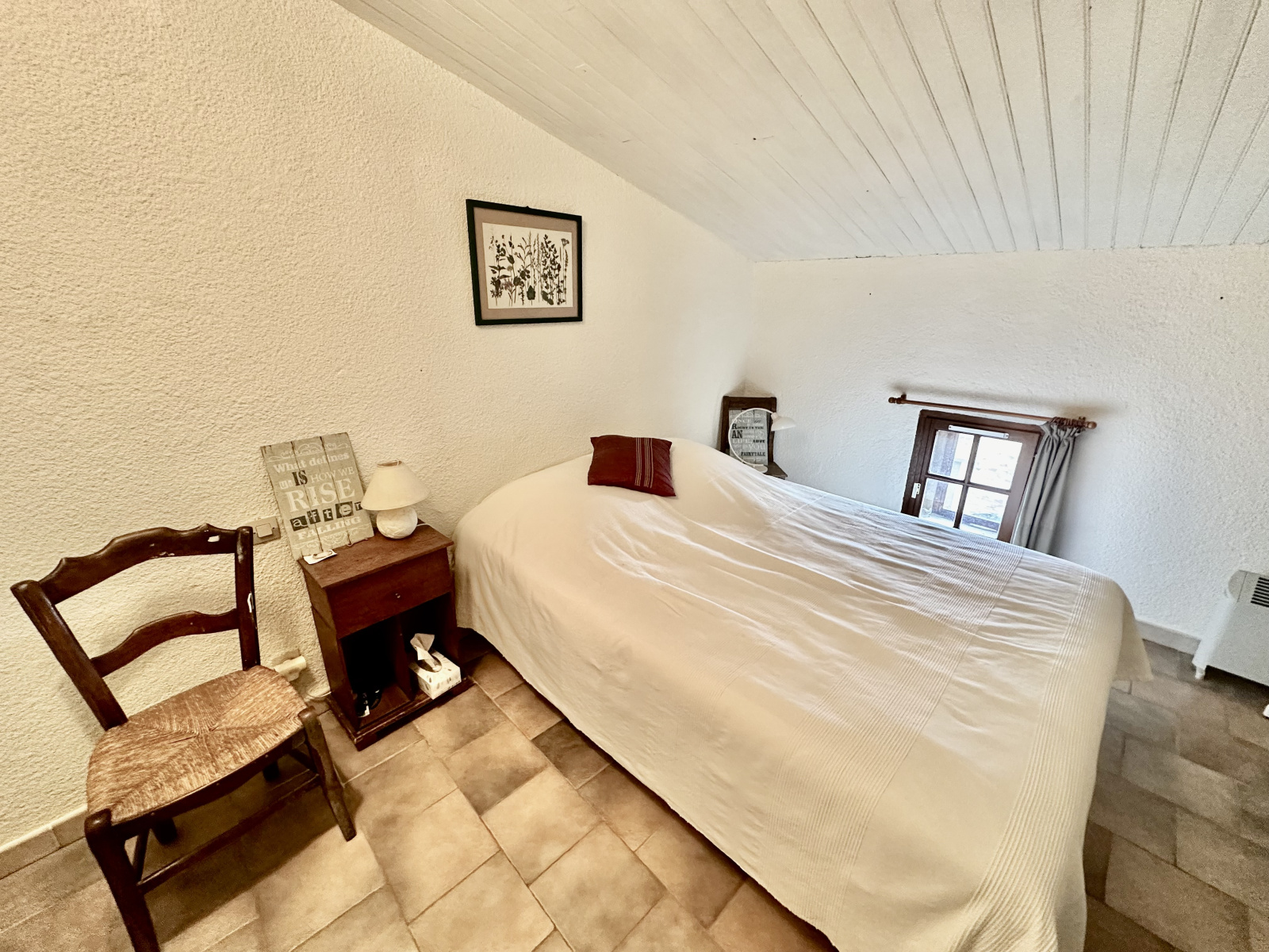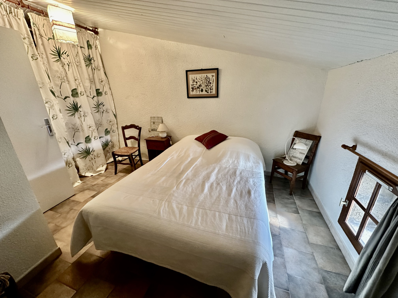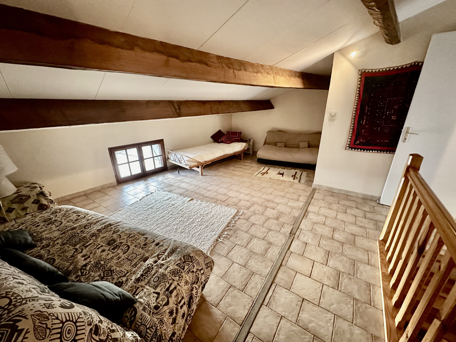 La maison compte également deux chambres confortables, un espace mezzanine actuellement utilisé comme dortoir, une salle de bains, et une salle d'eau. La disposition sur deux niveaux offre une intimité appréciable, avec des sanitaires disponibles à chaque étage.