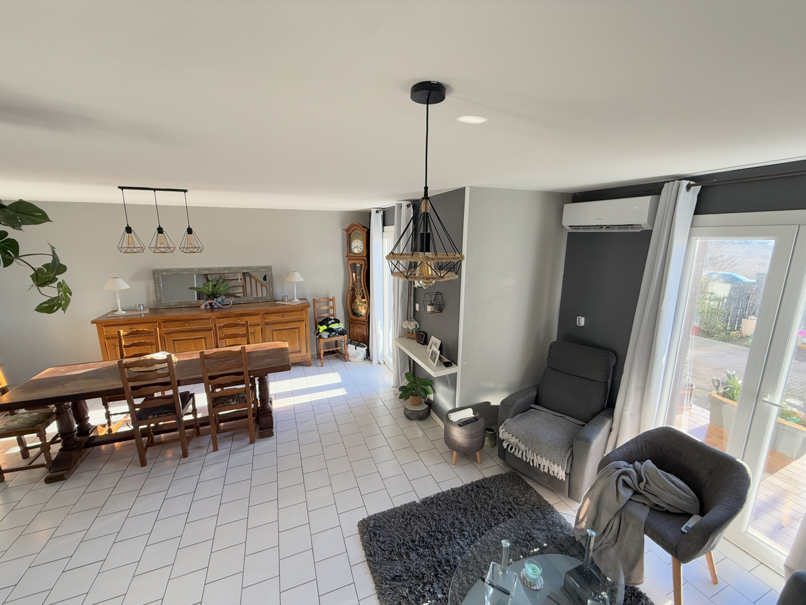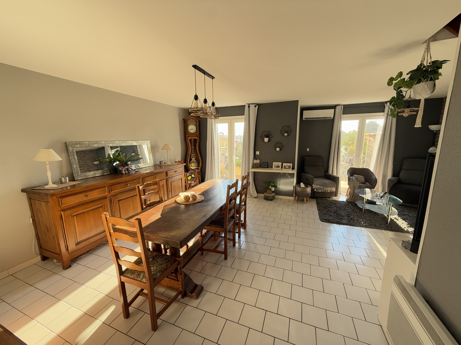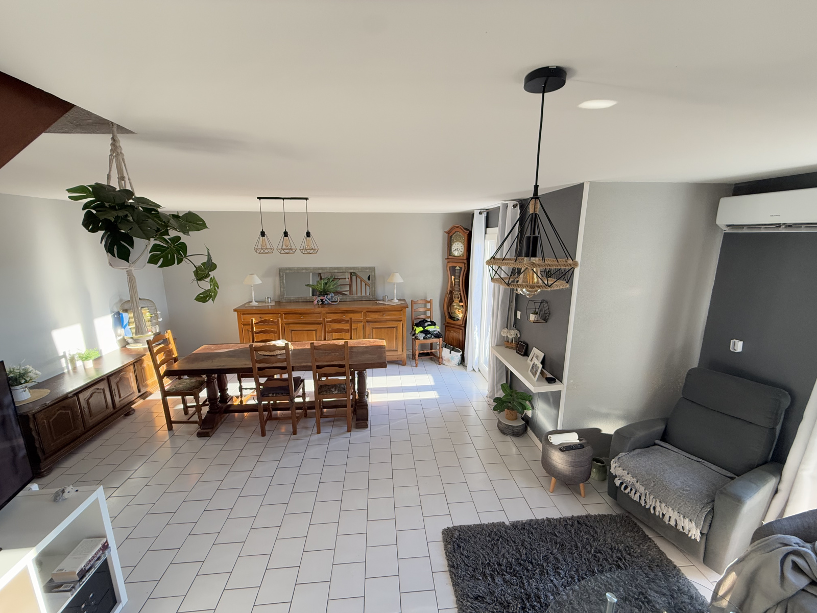 La maison se compose au rez-de-chaussée d’une cuisine séparée entièrement rénovée, d’une pièce à vivre lumineuse et d’un garage avec un accès direct à la maison. À l’étage, elle dispose de trois chambres dont une avec terrasse, d’une salle de bains, d’un WC indépendant et d’une buanderie. Le bien est équipé de la climatisation réversible, garantissant un confort optimal en toute saison.
