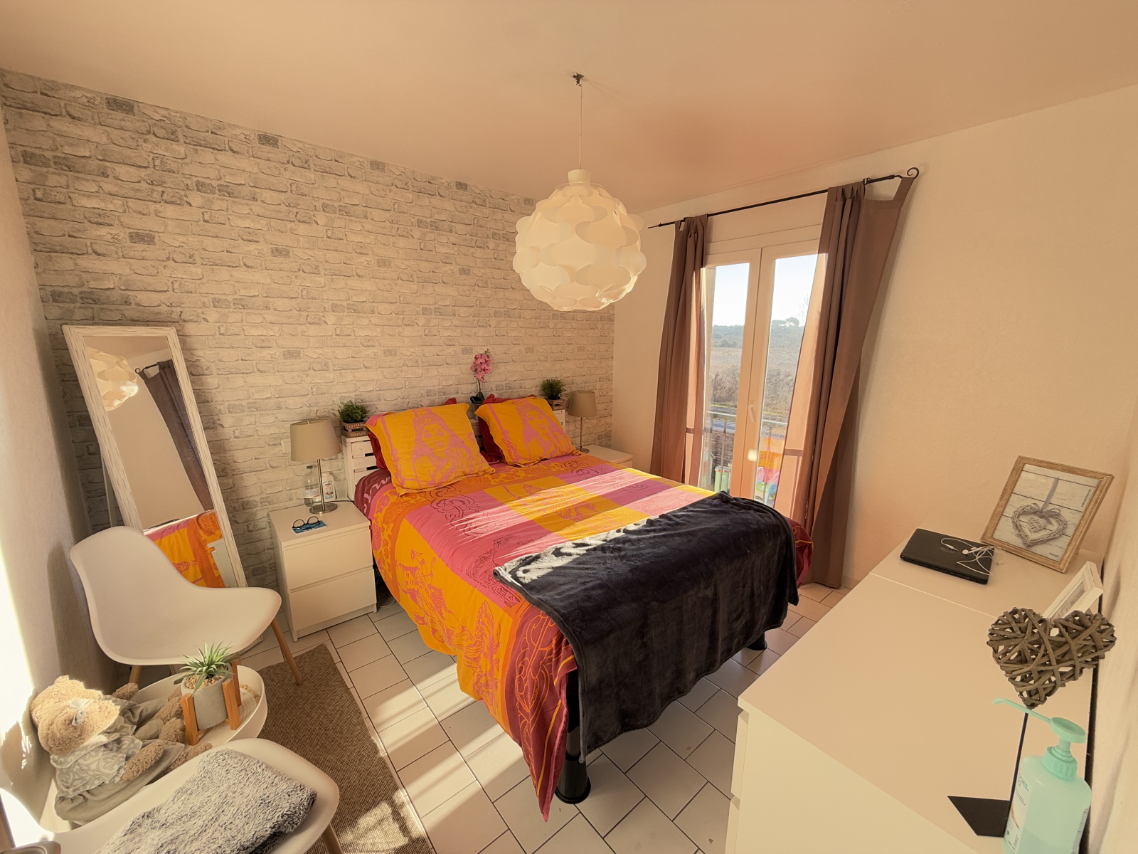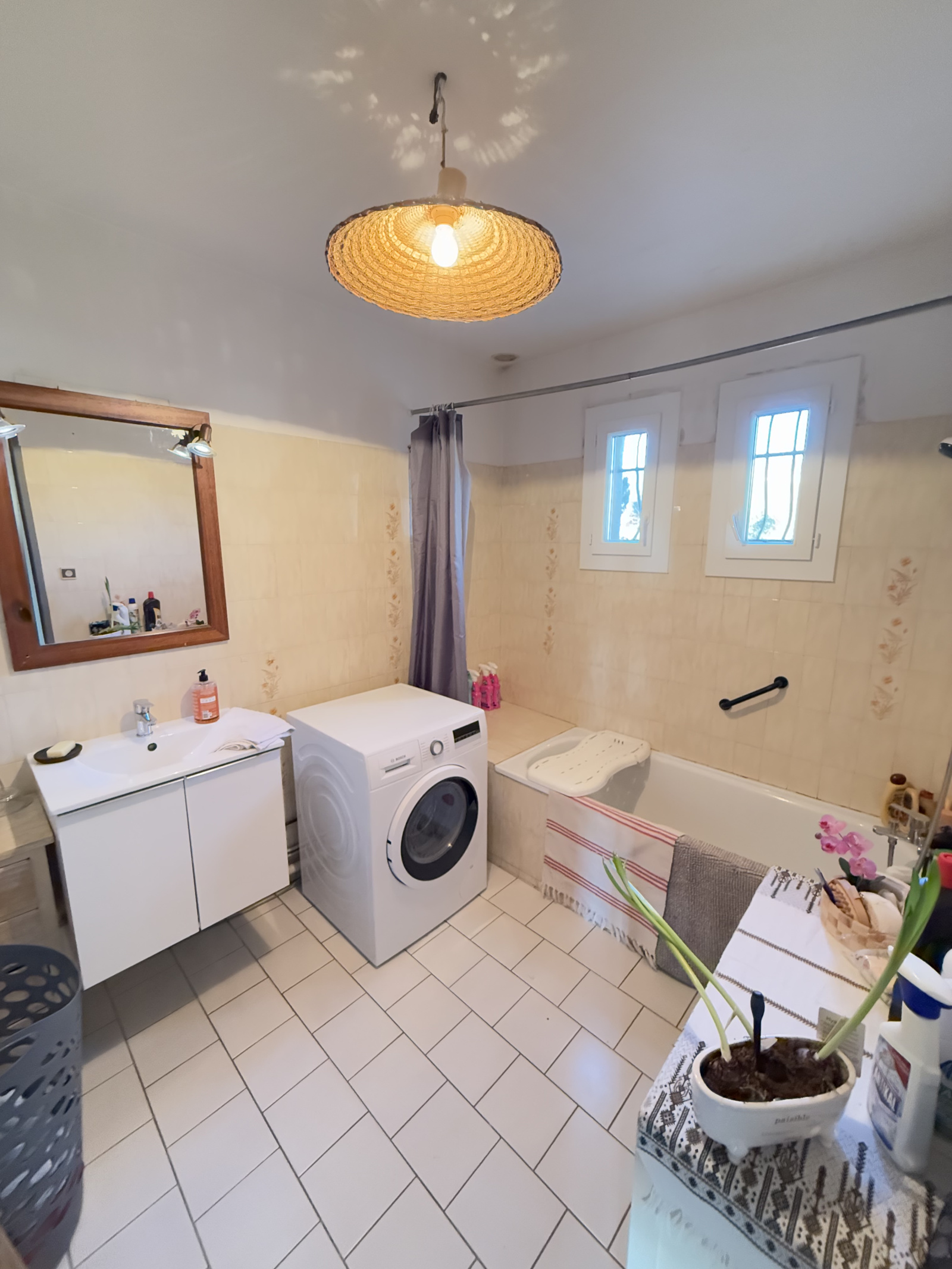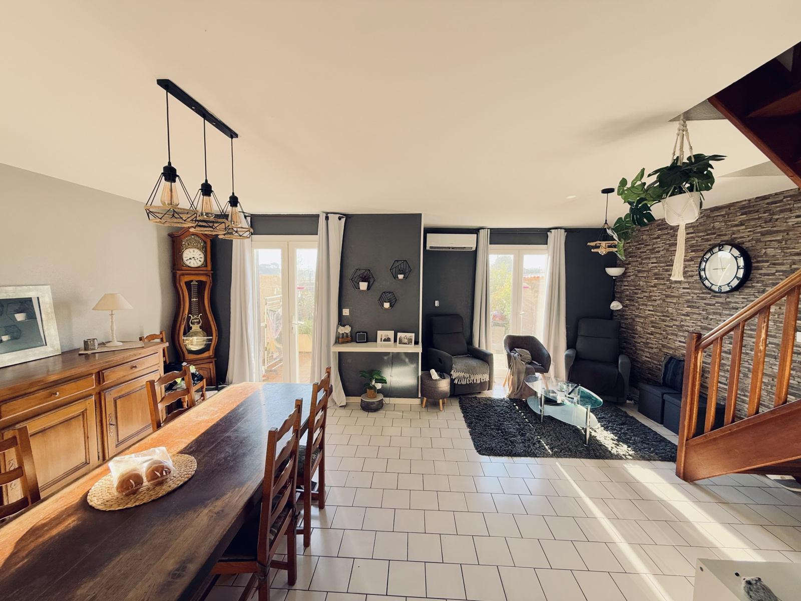 La maison se compose au rez-de-chaussée d’une cuisine séparée entièrement rénovée, d’une pièce à vivre lumineuse et d’un garage avec un accès direct à la maison. À l’étage, elle dispose de trois chambres dont une avec terrasse, d’une salle de bains, d’un WC indépendant et d’une buanderie. Le bien est équipé de la climatisation réversible, garantissant un confort optimal en toute saison.